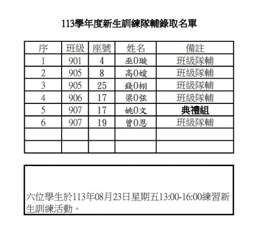 協助113學年度新生訓練的八九年級隊輔同學,請留意到校時間