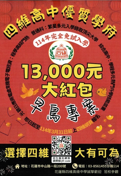 四維學校財團法人花蓮縣四維高級中學114學年度完全免試入學早鳥專案