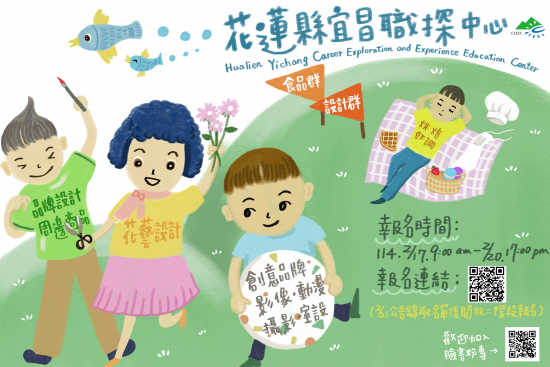 三、第一階段報名時間自114年2月17日9:00至2月20日17:00,請逕自報名網址https://reurl.cc/86MzaX進行報名作業,或於「花蓮縣宜昌區域職業試探與體驗示範中心」粉專點選報名連結,或掃描海報QR code報名。
