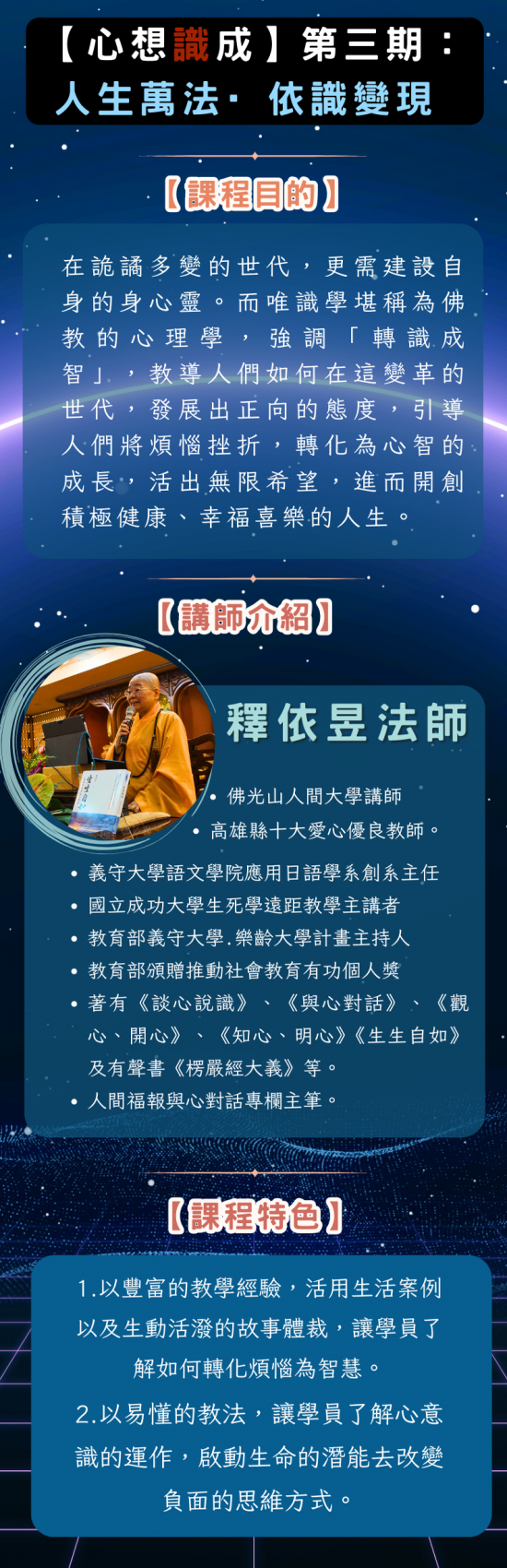 為提升大眾應用「唯識學」從而提升自我覺察和身心靈健康,南華大學終身學習學院特辦理本線上課程,課程講師為佛光山人間大學講師-釋依昱博士,其以精通佛教唯識學之專長,並以生活化淺顯方式,傳授如何運用唯識學技巧:說心、說性、說識、說相,「一切唯心,萬法唯識」..,並引導大眾以佛法轉念成智,獲取心靈的平靜與內在的智慧