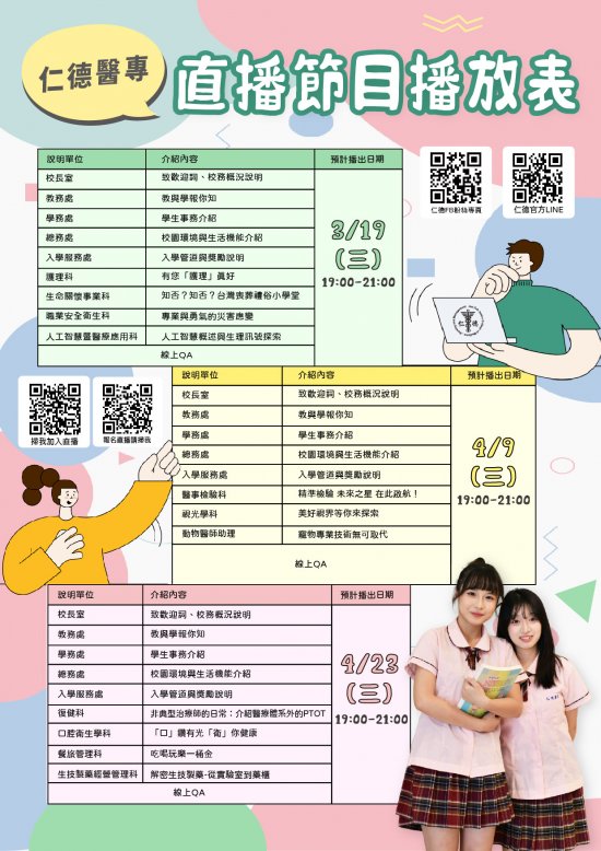 一、分別於3/19(三)、4/9(三)及4/23(三) 晚上19:00~21:00特別舉辦三場線上說明會,除了說明五專完全免試入學、優先免試入學及聯合免試入學的報名須知之外,也邀請本校相關主管線上面對面提供諮詢服務,可以更了解入學前後各項重要資訊,歡迎踴躍報名參加。