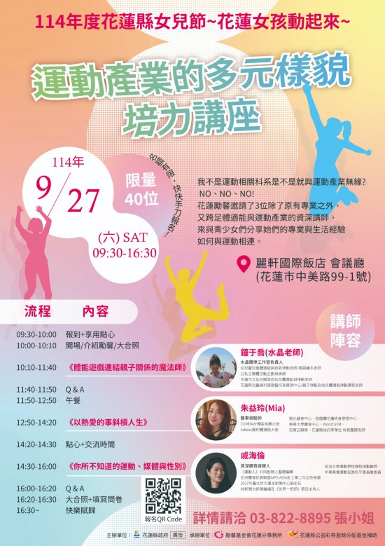 一、為提升青少女將運動融入生涯與職涯規劃之認識與關注,該會將於114年9月27日舉辦「運動產業的多元樣貌培力講座」,並邀請水晶體律工作室負責人鐘于喬老師 、 ZUMBA台灣推廣大使朱益玲老師及資深體育記者戚海倫小姐擔任講師。