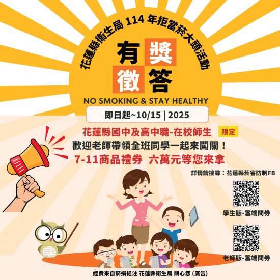 公告獲獎:114年10月下旬以電腦隨機抽出獲獎人,11月上旬於花蓮縣衛生局網站、花蓮縣菸害防制FB,公佈獲獎名單!