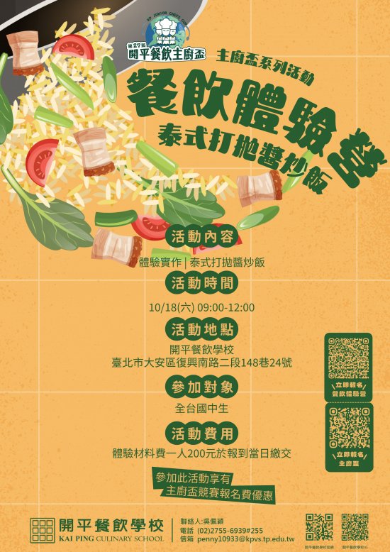 一、本次活動結合第27屆主廚盃國中競賽活動,透過「泰式打拋醬炒飯」實作體驗更加了解技職教育,以料理展現自我、創造未來無限可能。