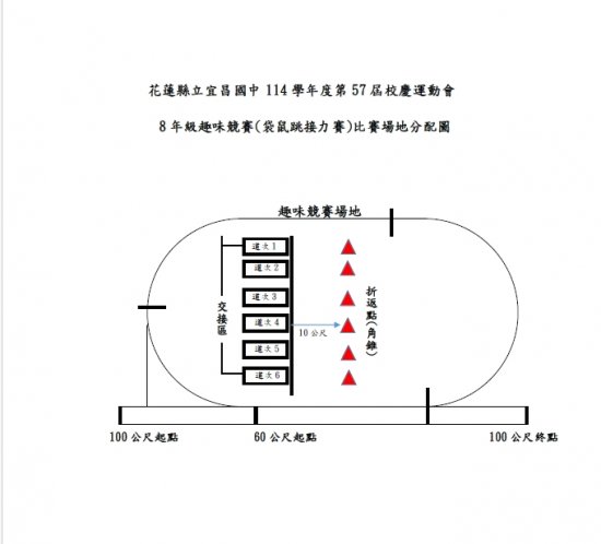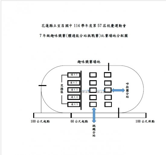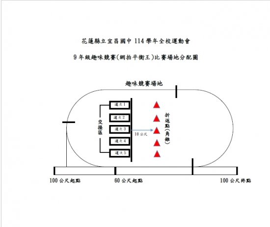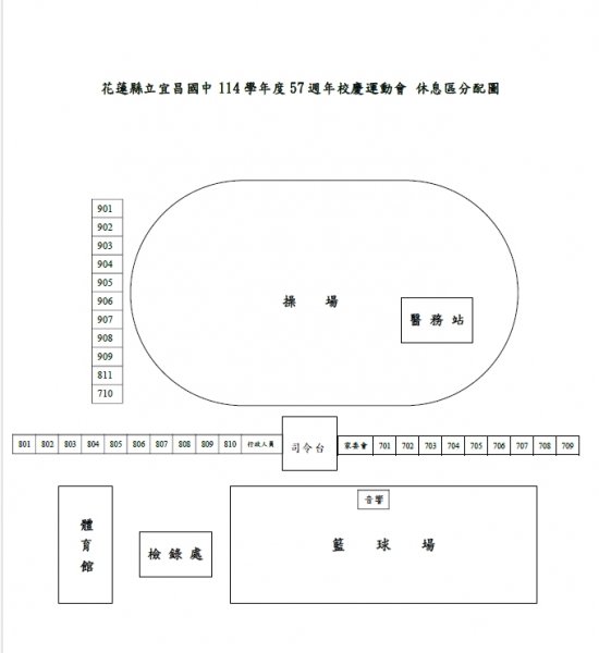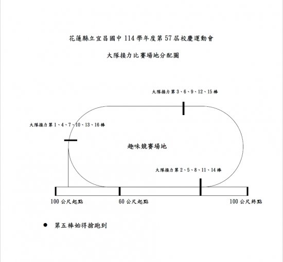 三、另為利各班級及參賽學生事前準備,七、八、九年級大隊接力、趣味競賽之競賽規程及各班休息區位置圖,已一併公告(請參閱附件),請各班級務必詳閱。