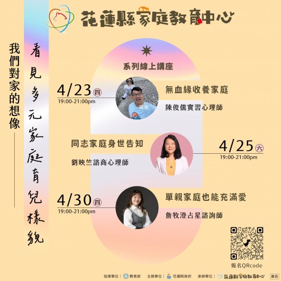 本系列線上講座共辦理8場次,請鼓勵所屬人員報名參加,並准予公假。課程資訊詳如附件(網址路徑:花蓮縣家庭教育中心 /報名專區/性別教育https://hlc.familyedu.moe.gov.tw/docList.aspx?uid=8948&pid=8943&rn=-6189 )。