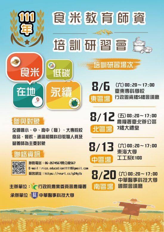研習相關問題請洽中華醫事科技大學林怡如小姐,電話:06-2674567轉567,E-mail:rice.education11118@gmail.com。