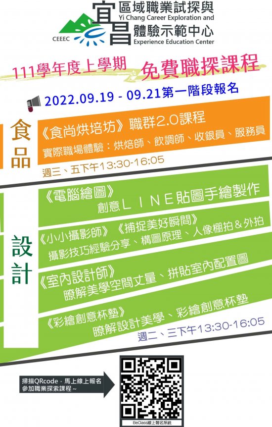 第一階段報名時間自111年9月19日9時起至111年9月21日17時止,請逕自前往宜昌國中校網公告中點選報名連結,或至 BeClasseClass 線上報名系統搜尋「宜昌國中」(https://bit.ly/3KUgxBv )進行報名作業,錄取名單將於111年9月23日公布 於宜昌國中校網公告中。