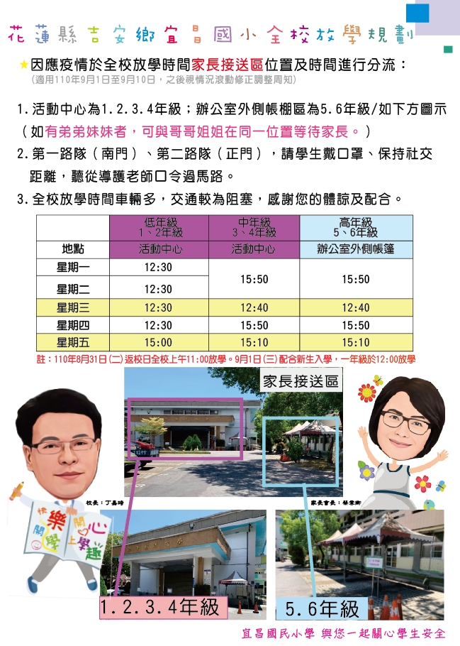 因應疫情,規劃家長接送區放學位置分區 適用時間為 8/31-9/10 1-4 年級於活動中心、 5-6 年級於辦公室外側帳篷區 遇大放學時間低年級與中高年級時間錯開十分鐘 如果有同一家孩子跨年級,建議以較高年級哥哥姊姊帶著弟弟妹妹在同一區域等待家長 感謝您的協助及配合!
