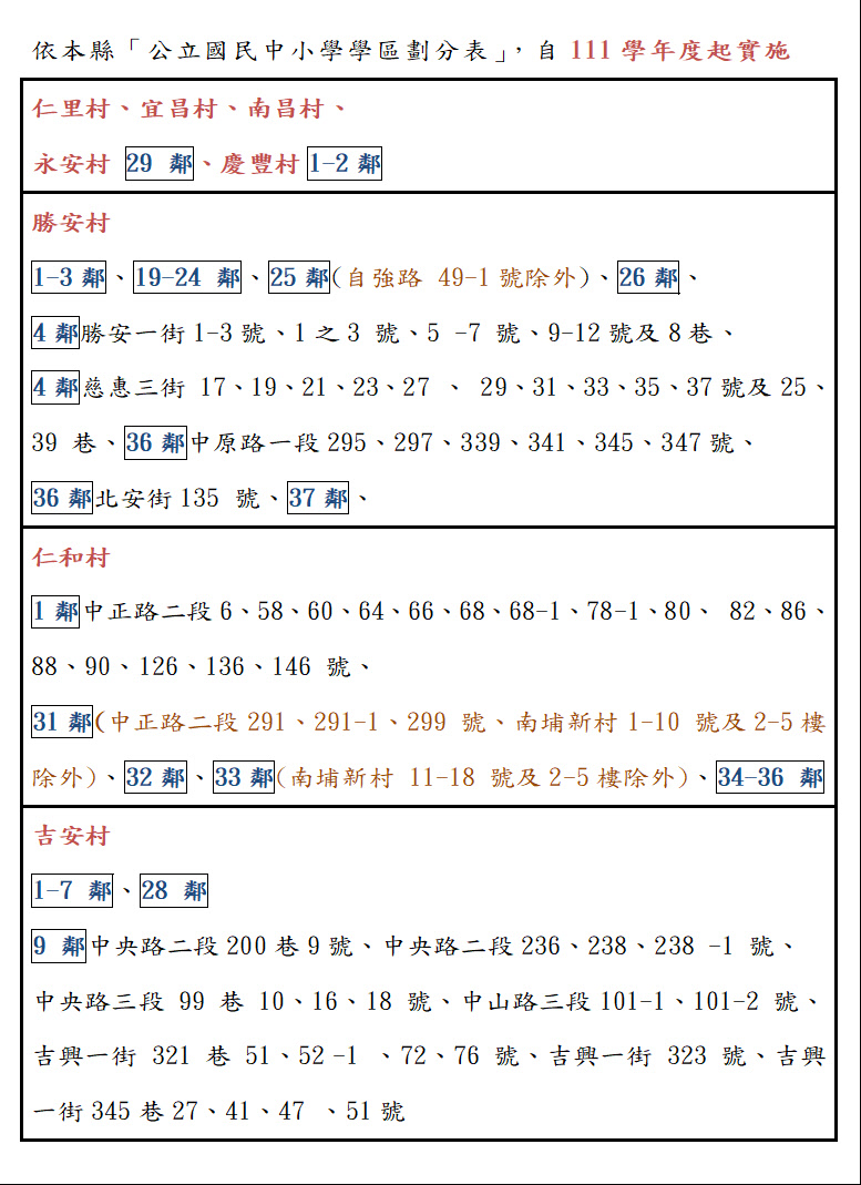 三、吉安鄉 干城 村 、仁安村、仁里村、仁和村、北昌村、永安村、永興村、吉安村、東昌村、南昌村、福興村及慶豐村等 12 村部分鄰重新整編。 新城鄉北埔村調整劃分為北埔村及新秀村。業於 110 年 1 月 1 日生效 。