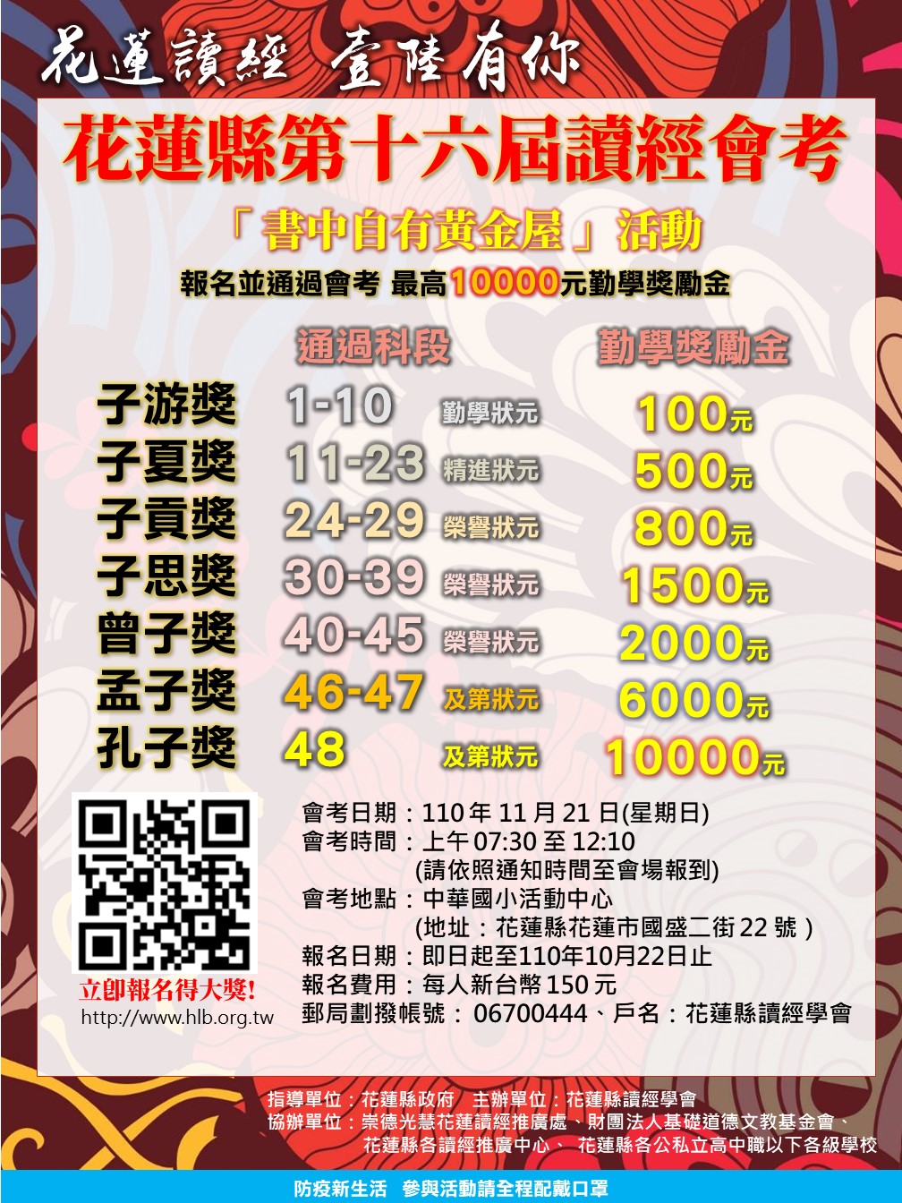 轉知花蓮縣讀經學會辦理「第十六屆讀經會考」活動報名延長至110年10月22日(星期五)