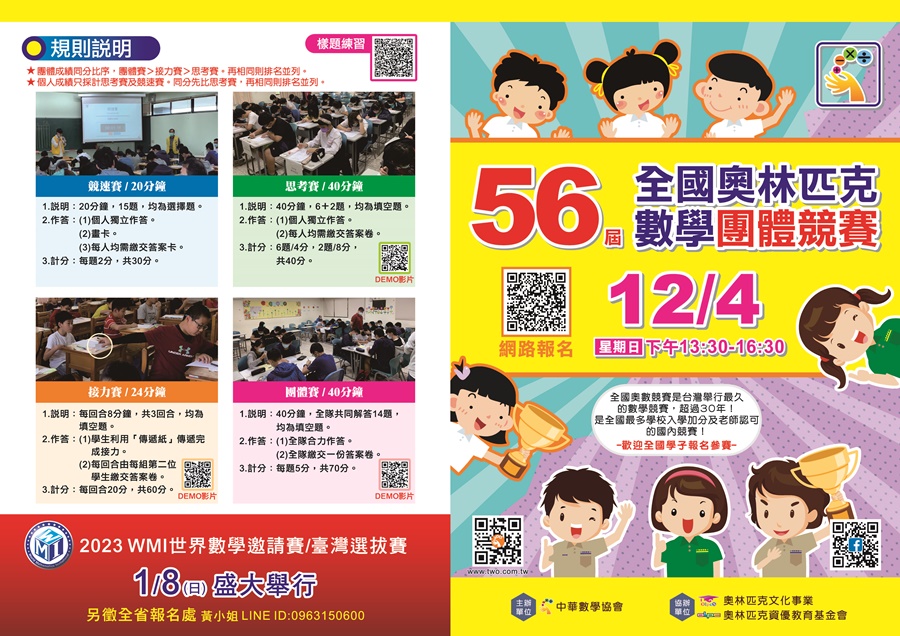 檢附「第 56 屆全國奧林匹克數學團體競賽」跟「2023 年臺灣區小學數學奧林匹亞競賽簡章」競賽活動簡章,供參閱。