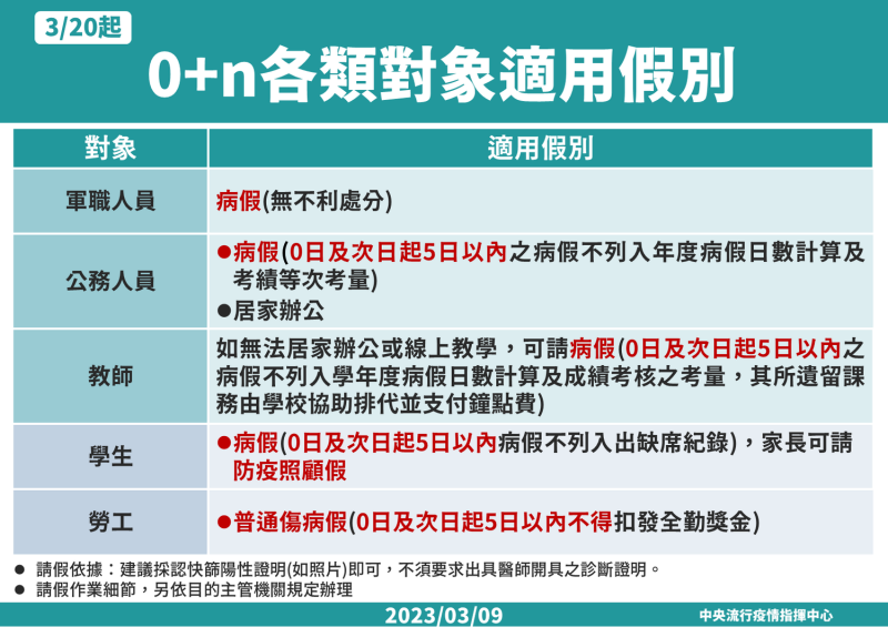 | 三、 | 教職員工生如篩檢陽性輕症或無症狀,仍依指揮中心 112 年 3 月 9 日建議進行「0+n 自主健康管理」及假別(「0+n 各類適用對象假別」圖卡)規定辦理。 |