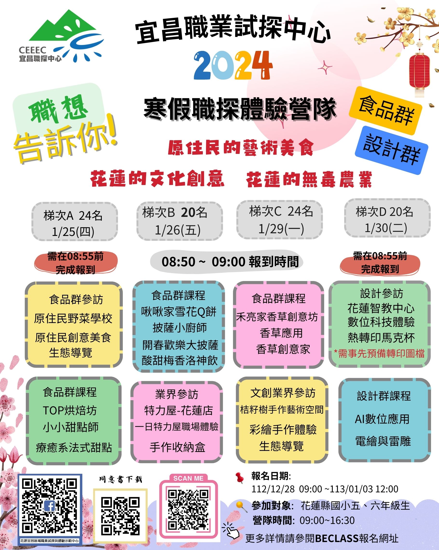 本縣宜昌國民中學開設花蓮縣區域職業試探與體驗示範中心 112 學年度寒假營隊課程相關資料,鼓勵本縣各國民小學踴躍報名參加,請參考附件!