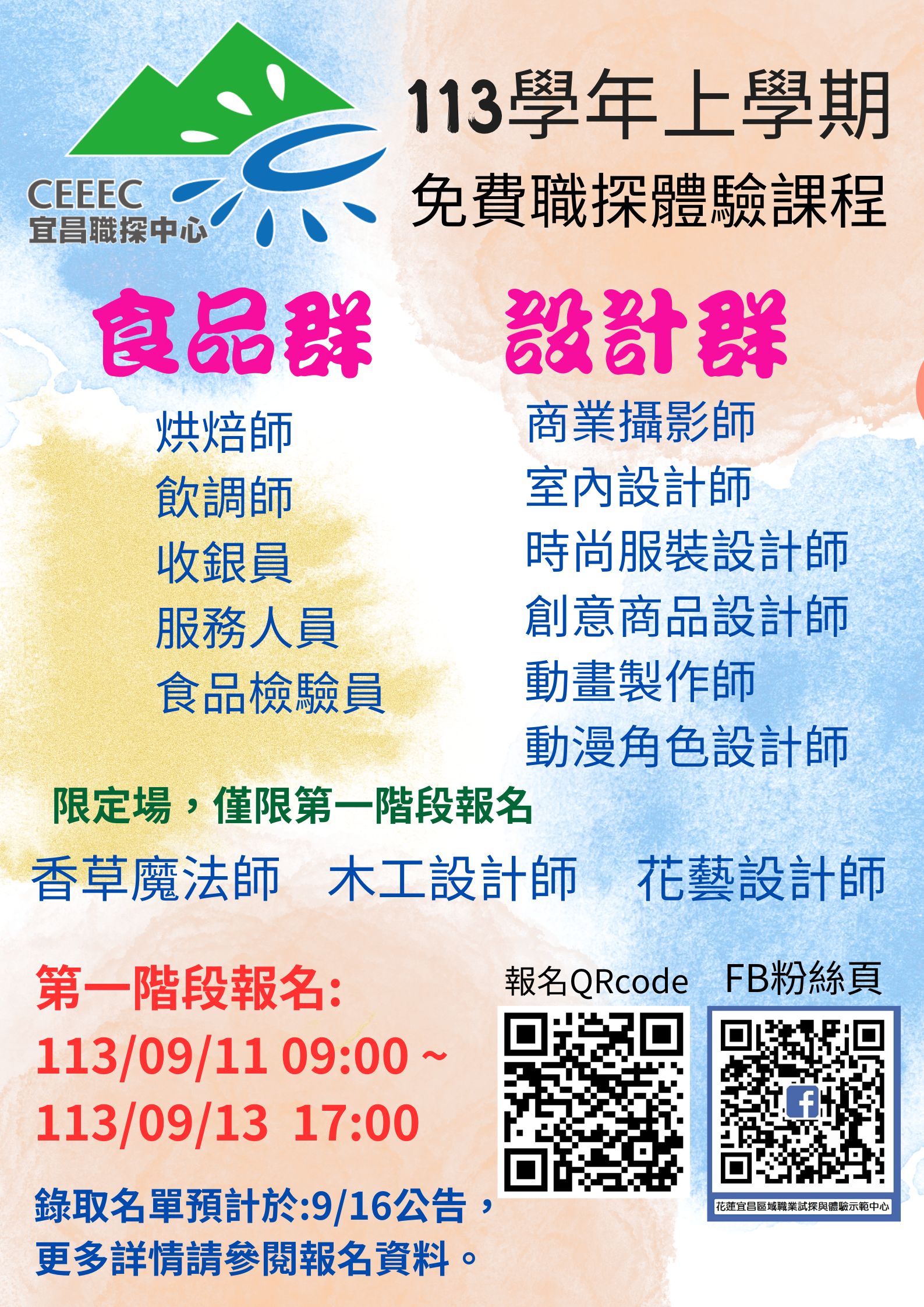 四、報名時間: 第一階段: 113 年 9 月 11 日 9:00 至 9 月 13 日 17 : 00 。 (9 月 16 日於本中心粉專公告錄取結果) 第二階段:第一階段之餘額開放報名至該課程開課日前一週截止。