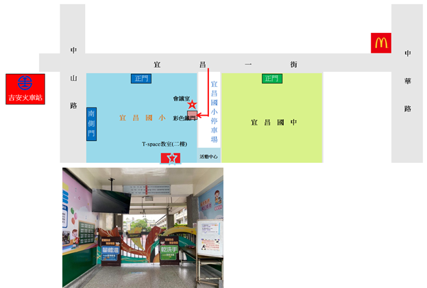 二、請錄取學員,最遲於明天(3/18)下午 1 點 5 分,於本校彩虹門前集合,將有專人帶學生上樓上課,集合地點如下方附圖(就讀宜昌國小學生,會有專人到班上接學生)。