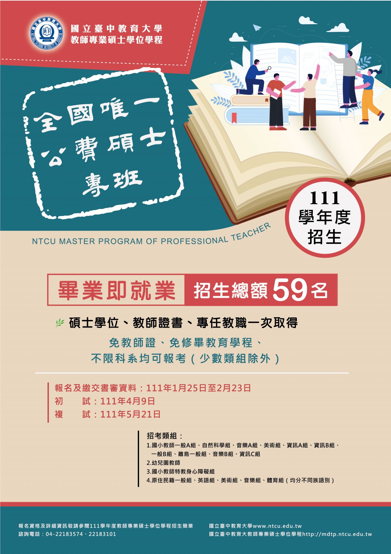 一、國立臺中教育大學教師專業碩士學位學程為碩士公費師資專班,教師證書、專任教職、碩士學位一次取得,歡迎有志投入偏鄉教育志業的學子及代理代課教師報考。