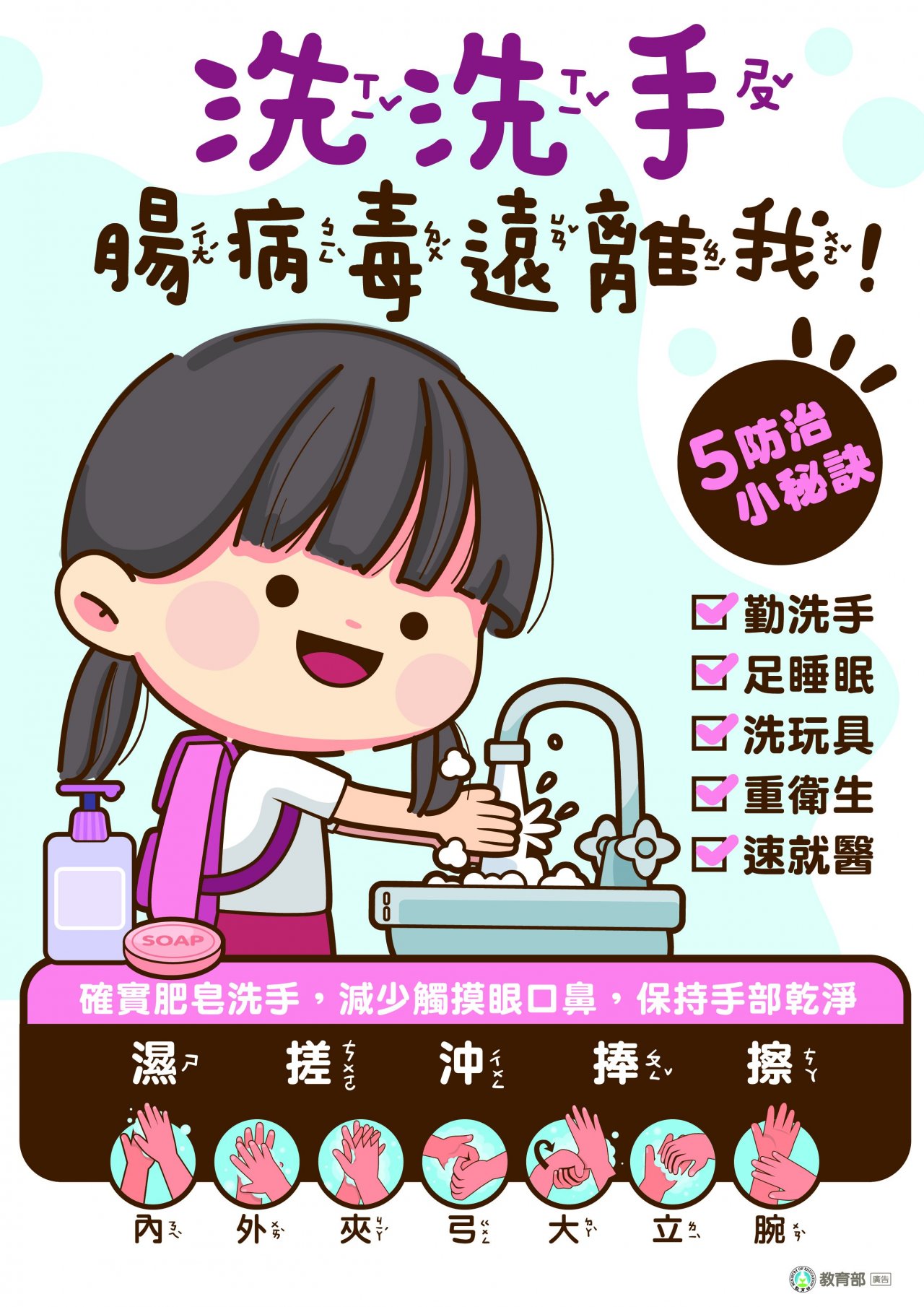 主旨: | 為因應近期國內腸病毒疫情有上升趨勢,教育部製作腸病毒宣導海報電子檔1份,請學校及幼兒園參考運用,並加强腸病毒防治工作,請查照。 |