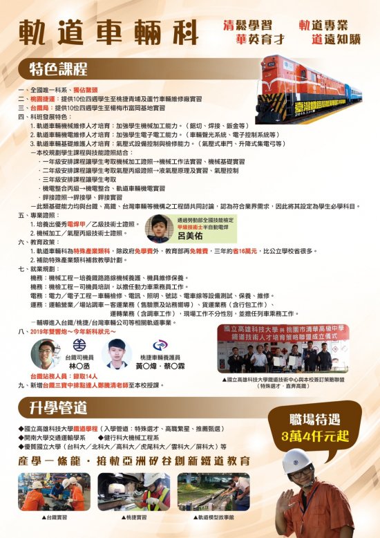二、國內唯一,培養軌道專業人才的學校,培育維修、保養、營運等軌道專業人員。
