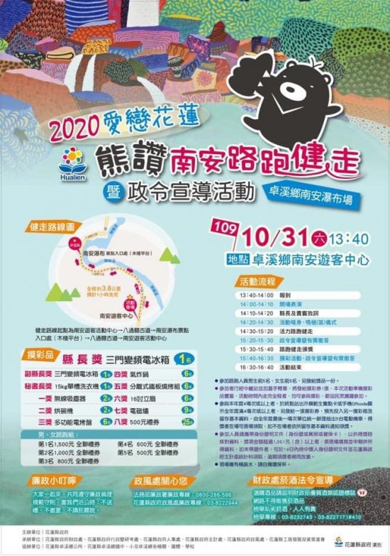 縣府訂於本(109)年10月31日(星期六)於花蓮縣卓溪鄉南安遊客中心辦理「2020愛戀花蓮熊讚南安路跑健走暨政令宣導活動-卓溪鄉南安瀑布場」,惠請鼓勵所屬同仁及眷屬踴躍參加,請查照。