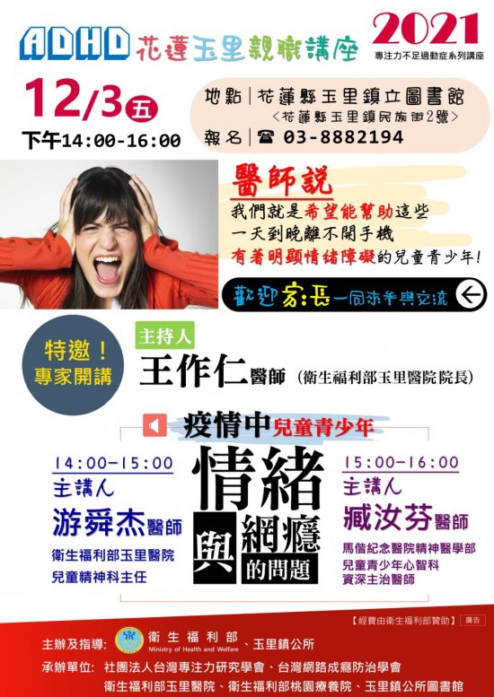 四、該院誠摯邀請學校老師、校護、家長及有興趣之一般民眾共同參與,藉由講題了解當面臨過動症孩子如何與之相處,及防疫期間3C產品的健康使用,了解疫情期間,當使用3C使用頻率變高時,如何能健康使用3C產品。