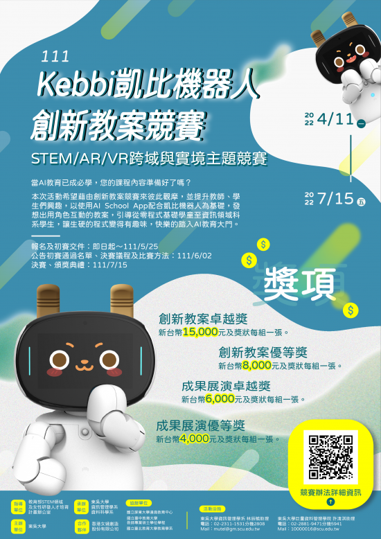一、 為提升教師、學生們對AI教育興趣,藉由使用AI School App 配合凱比機器人為基礎,發想創新教案。本校資訊管理學系、資料科學系與國立屏東大學通識教育中心、國立臺中教育大學教師專業碩士學位學程、 國立臺北教育大學教育學系共同規劃,舉辦「STEM/AR/VR 跨域與實境主題競賽111年Kebbi凱比機器人創新教案競賽」。
