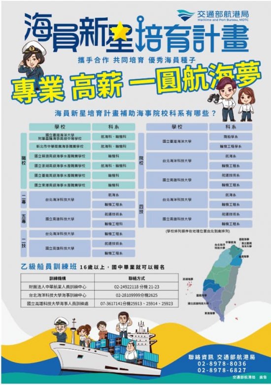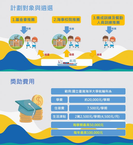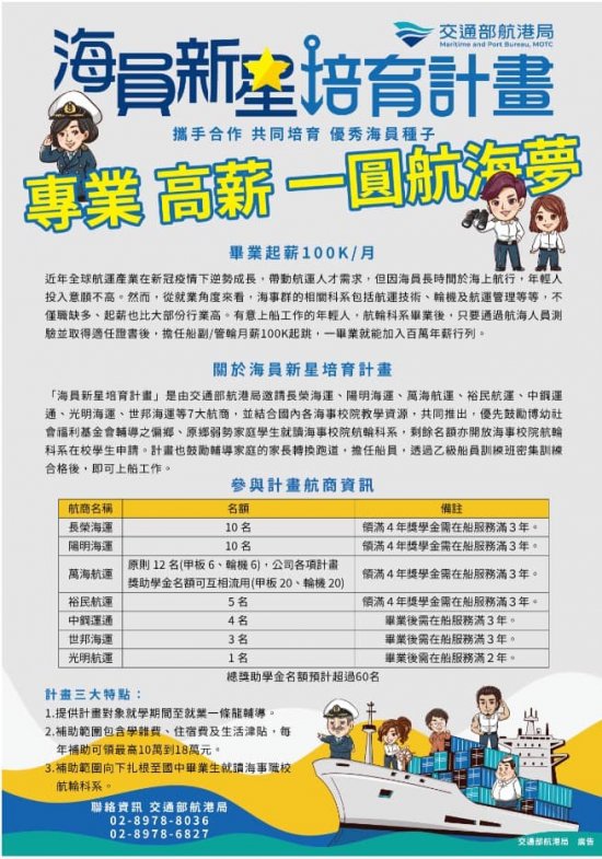 「海員新星培育計畫」是由交通部航港局邀請航運業者長榮海運、陽明海運、萬海航運、裕民航運、中鋼運通、光明海運、世邦海運等7大航商,並結合國內各海事校院教學資源,優先提供超過60個獎助名額機會給博幼基金會輔導對象,提供就學期間之獎助學金、住宿及生活津貼,從就讀海事校院期間的獎助學金至畢業後就業,提供一條龍的培育資源,如有剩餘名額,將釋出給目前就讀海事校院航輪科系學生申請。