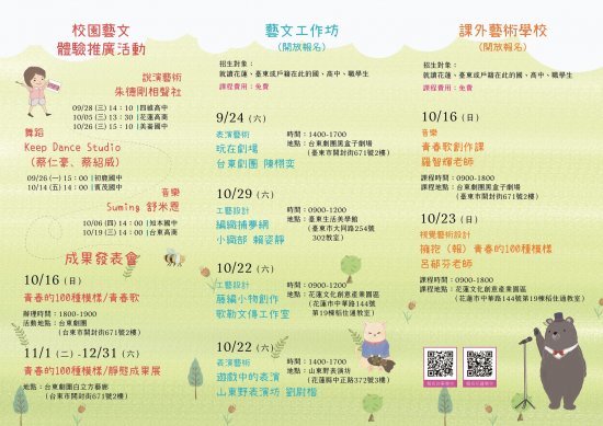 三、課外藝術學校-課程對象:就讀花蓮或戶籍在此的國、高中、職學生,課程費用:免費。