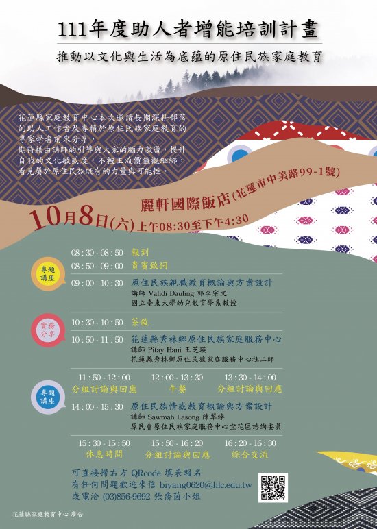 六、詳細課程資訊請下載海報參閱,可直接掃描海報右下方QRcode填表報名。有任何問題請洽(03)856-9692張喬茵小姐。