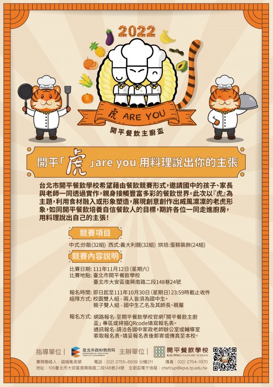 二、比賽類別:分「中式炒飯」、「義大利麵」及「蛋糕裝飾」三項。藉由「開平『虎』are you」為主題,老虎具威風凜凜的大眾印象,如同開平餐飲培養自信餐飲人的目標,邀請喜愛餐飲的國中生,能內觀自身興趣發展,並依主題盡情發揮創意,以料理展現自我、創造未來無限可能。