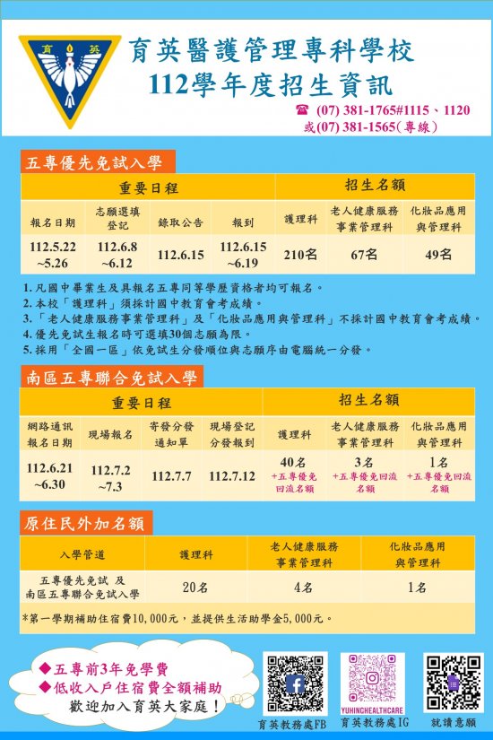 為協助國中家長及同學了解五專免試入學制度、積分採計方式及科別特色,舉辦「112學年度五專免試入學說明會」。