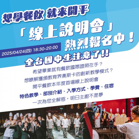 一、為使更多國中學生對技職教育深入瞭解,該校辦理「實體理念說明會」及「線上理念說明會」,提供學生、家長認 識本校教育理念與餐飲教學特色,協助增進國中學生及其 家長對職業類科升學管道及學習內容之試探,期望開平優秀學子成為臺灣及國際餐飲界之人才。
