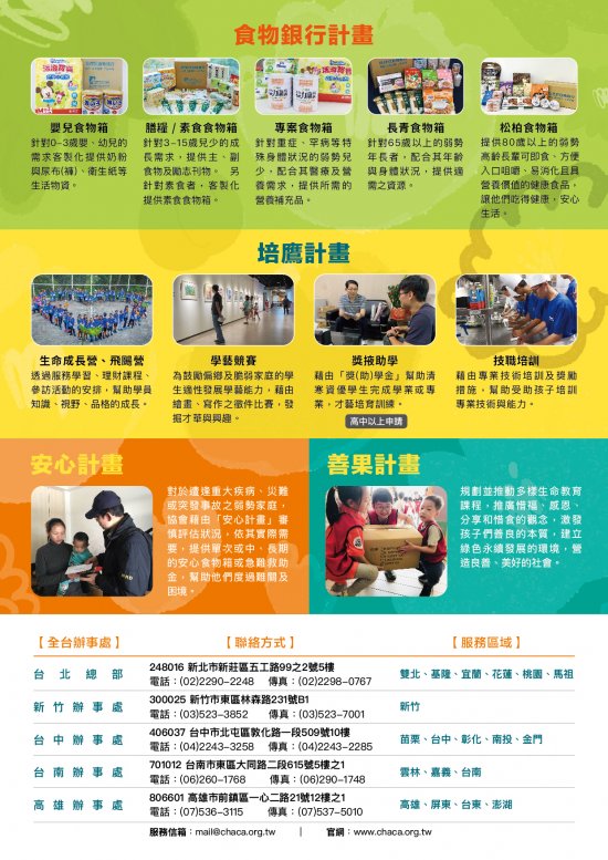 | 六、 | 如有相關疑義請逕洽該會聯絡人:馬明義專員,電話:02-2290-2248#5613,更多「膳糧食物箱」訊息可參考安得烈官網http://www.chaca.org.tw。 |