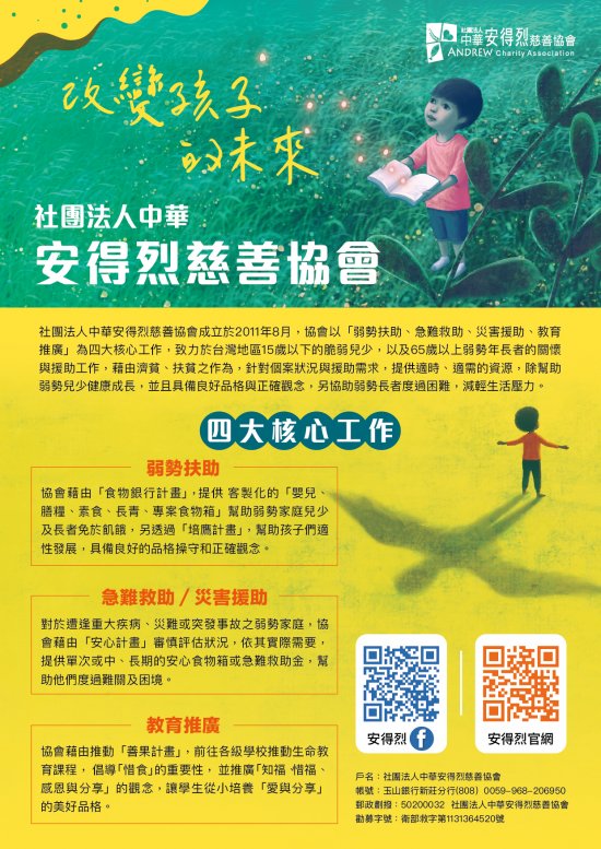 | 二、 | 該會成立於2011年8月,主要以「安得烈食物銀行」計畫,以每月配送乙箱食物箱的方式,幫助15歲(含)以下的弱勢家庭學子,獲得所需營養之主副食品。 |