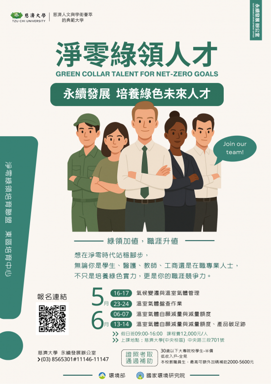 為配合環境部推動2050年淨零排放目標,強化本校永續發展整體能量,爰辦理「淨零綠領人才培育課程」,課程內容涵蓋氣候變遷、溫室氣體管理、碳盤查作業及產品碳足跡等核心主題。 |