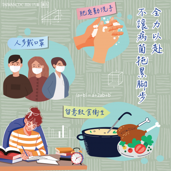 依據衛生福利部疾病管制署監測資料顯示,115年第6-7週(2月8日至2月21日)全國流感及腹瀉群聚疫情上升,且恰逢開學季,校園疫情傳播風險增加,請師生落實下列防治措施,以防範群聚事件發生及避免疫情擴散:
