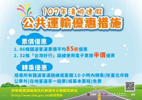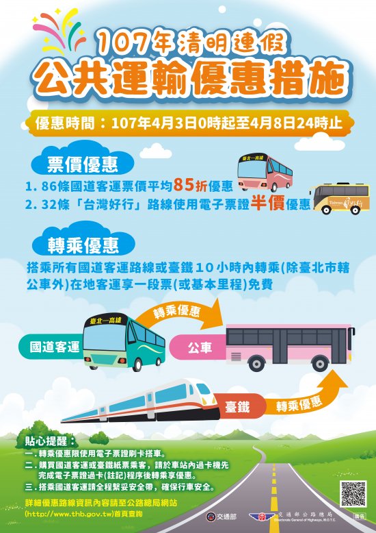 縣府函轉交通部公路總局臺北區監理所轉知交通部公路總局107年清明連續假期實施國道客運及「台灣好行」票價優惠,以及公共運輸轉乘優惠案