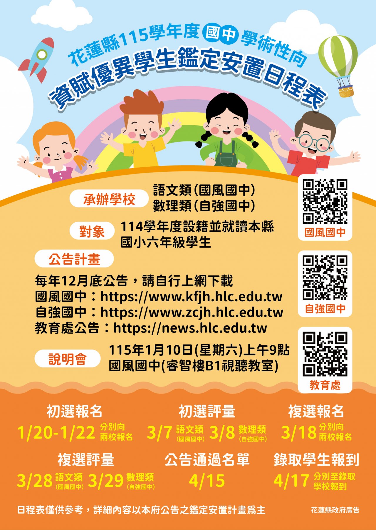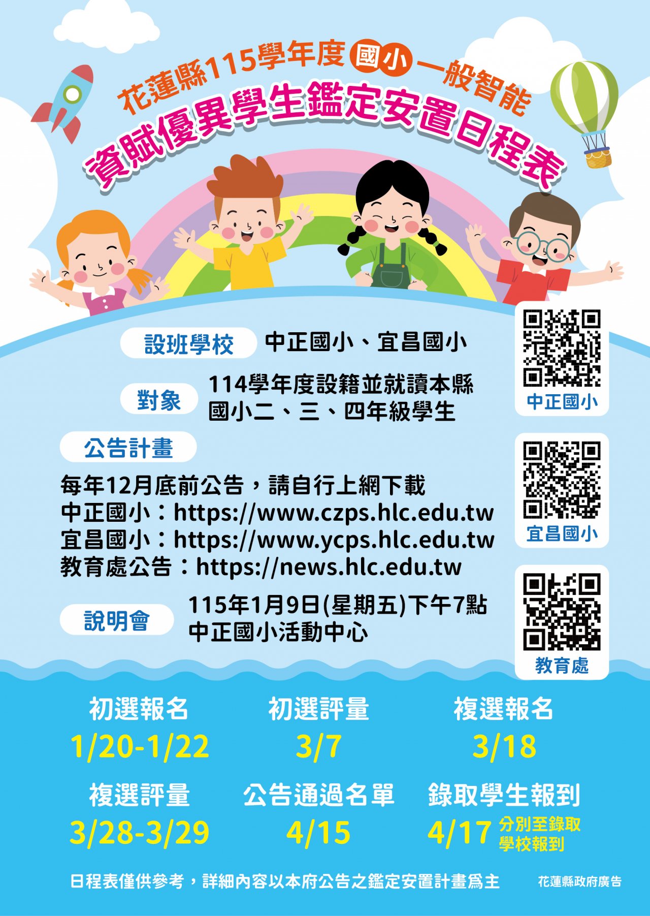 轉知115學年度國小一般智能及國中學術性向資優學生鑑定日程表