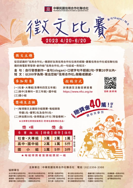 (一)比賽辦法、報名表及著作授權書等相關報名資料請至信聯社網站(https://www.nfcc.org.tw)首頁「信聯社40周年系列活動」/「徵文比賽」專區或各信用合作社官網下載。