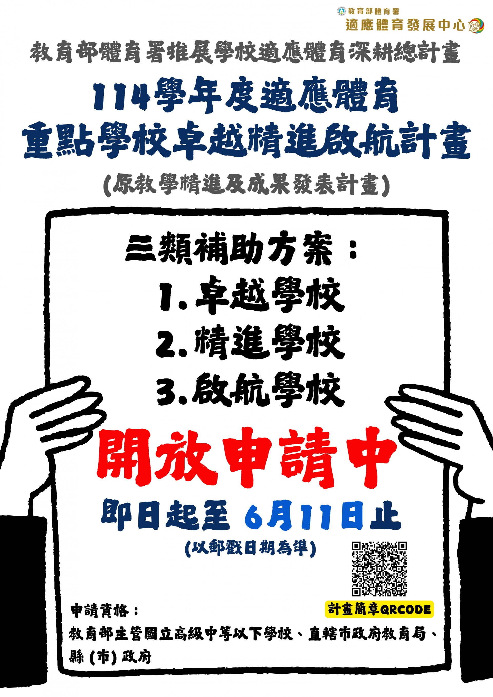 二、旨案係參考過往參與學校推動適應體育之經驗與需求,將原適應體育教學精進計畫與成果發表計畫合併規劃為三類補助方案,分別為第一類卓越學校、第二類精進學校及第三類啟航學校,透過分級補助機制,引導學校循序漸進發展適應體育,擴大影響層面,提升身心障礙學生的運動參與機會與教育品質。