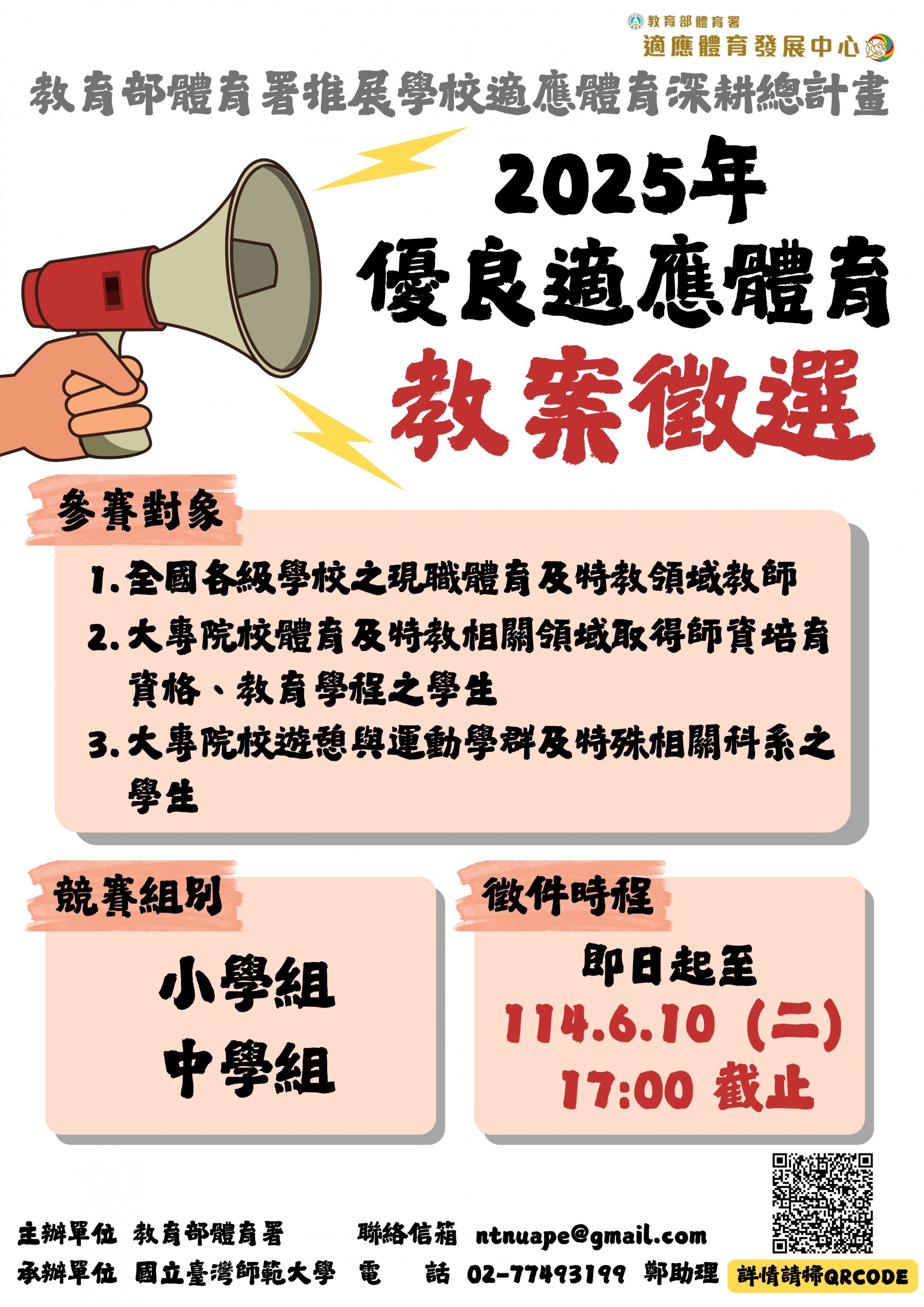 二、為鼓勵特殊教育與運動教育人員研發適應體育教材,將融合概念及身體素養融入各項體育教學活動中,幫助身心障礙學生與一般學生在運動中一起學習與成長,特委請國立臺灣師範大學辦理旨揭活動。