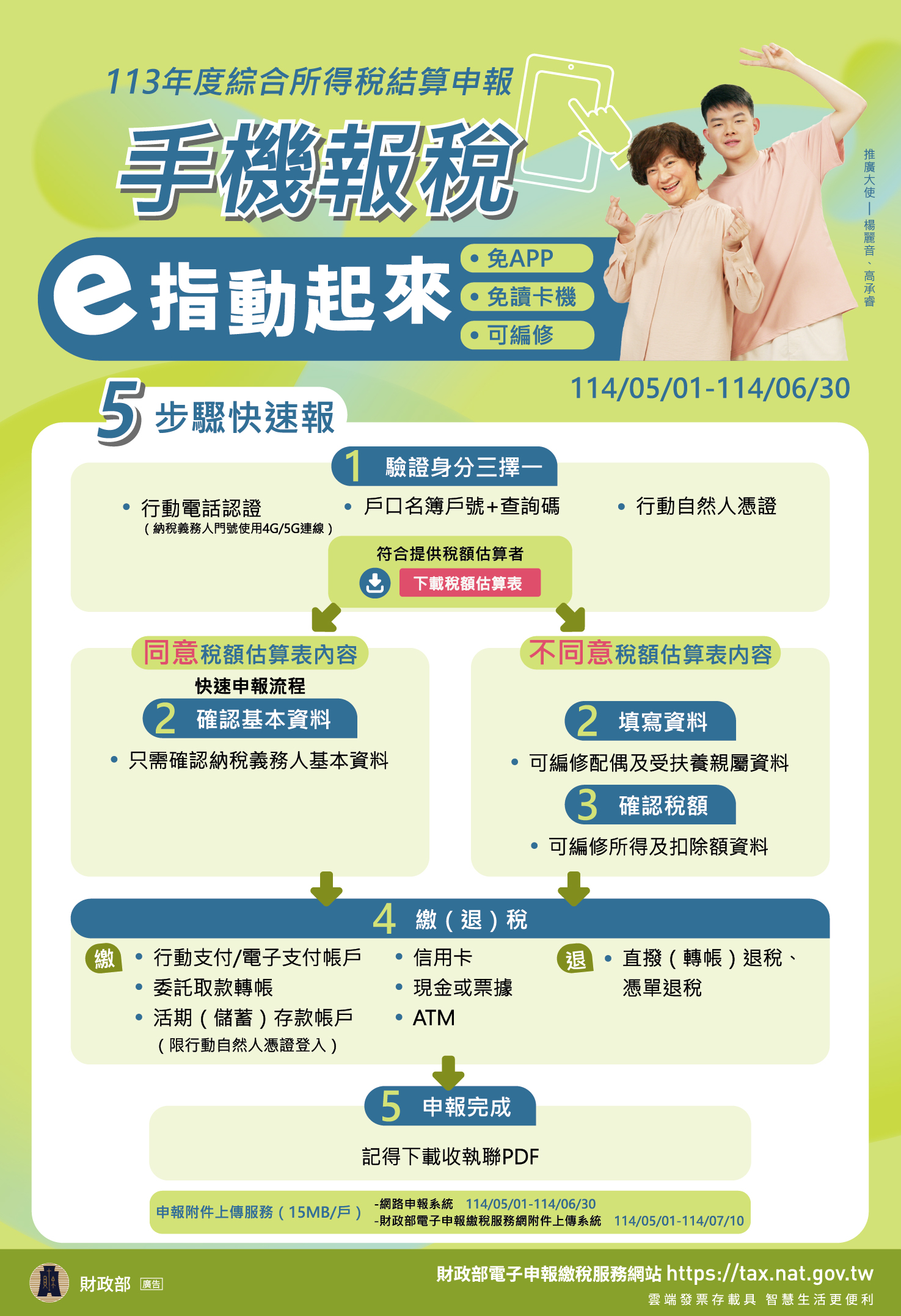 | (三) | 完成網路(含手機)報稅後,如有應檢附資料,可於結算申報期限內透過網路申報系統功能上傳,或於114年7月10日前至財政部電子申報繳稅服務網之「附件上傳」上傳,檔案大小合計以15MB為限。 |
