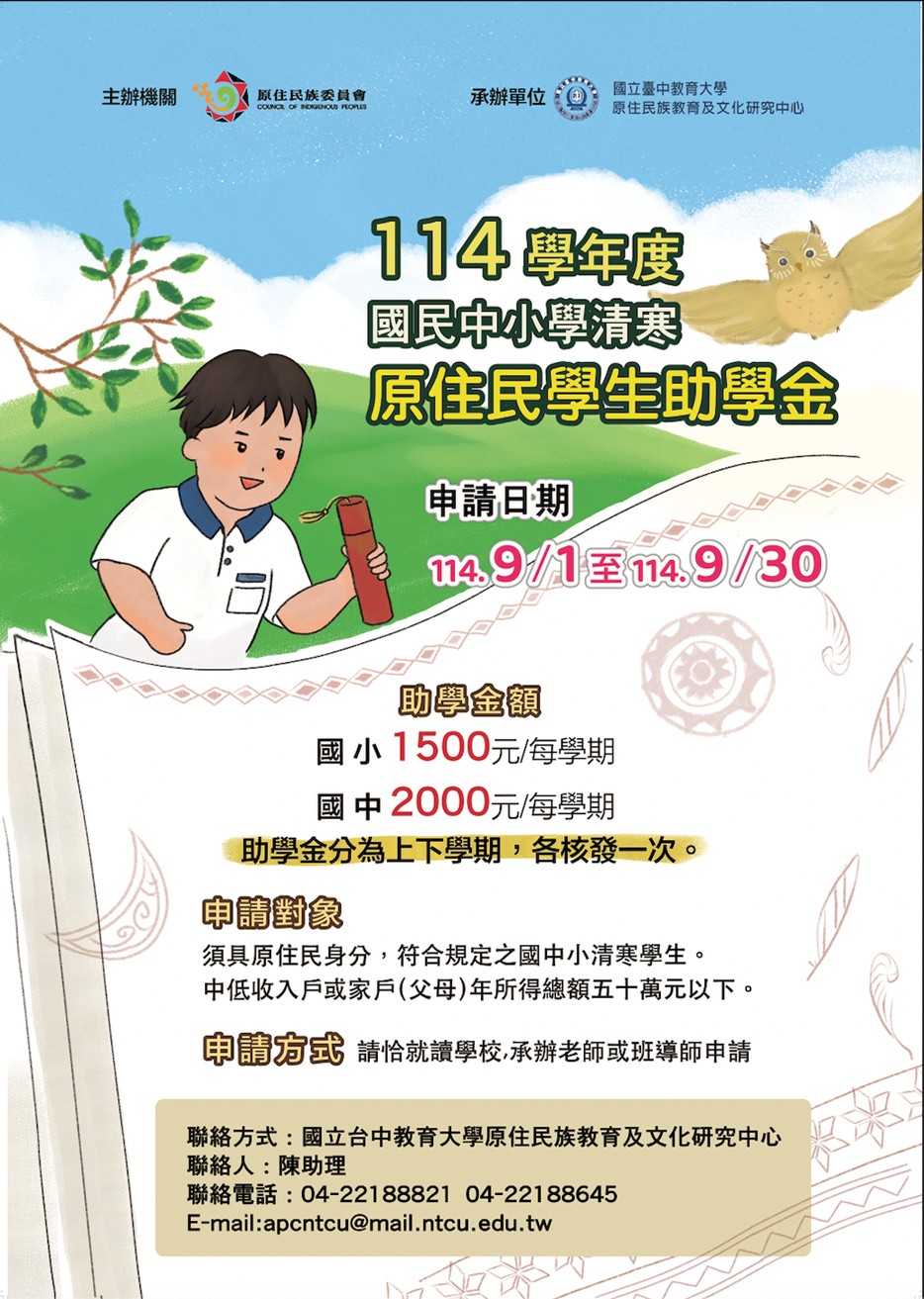 【公告】114學年度國民中小學清寒原住民學生助學金