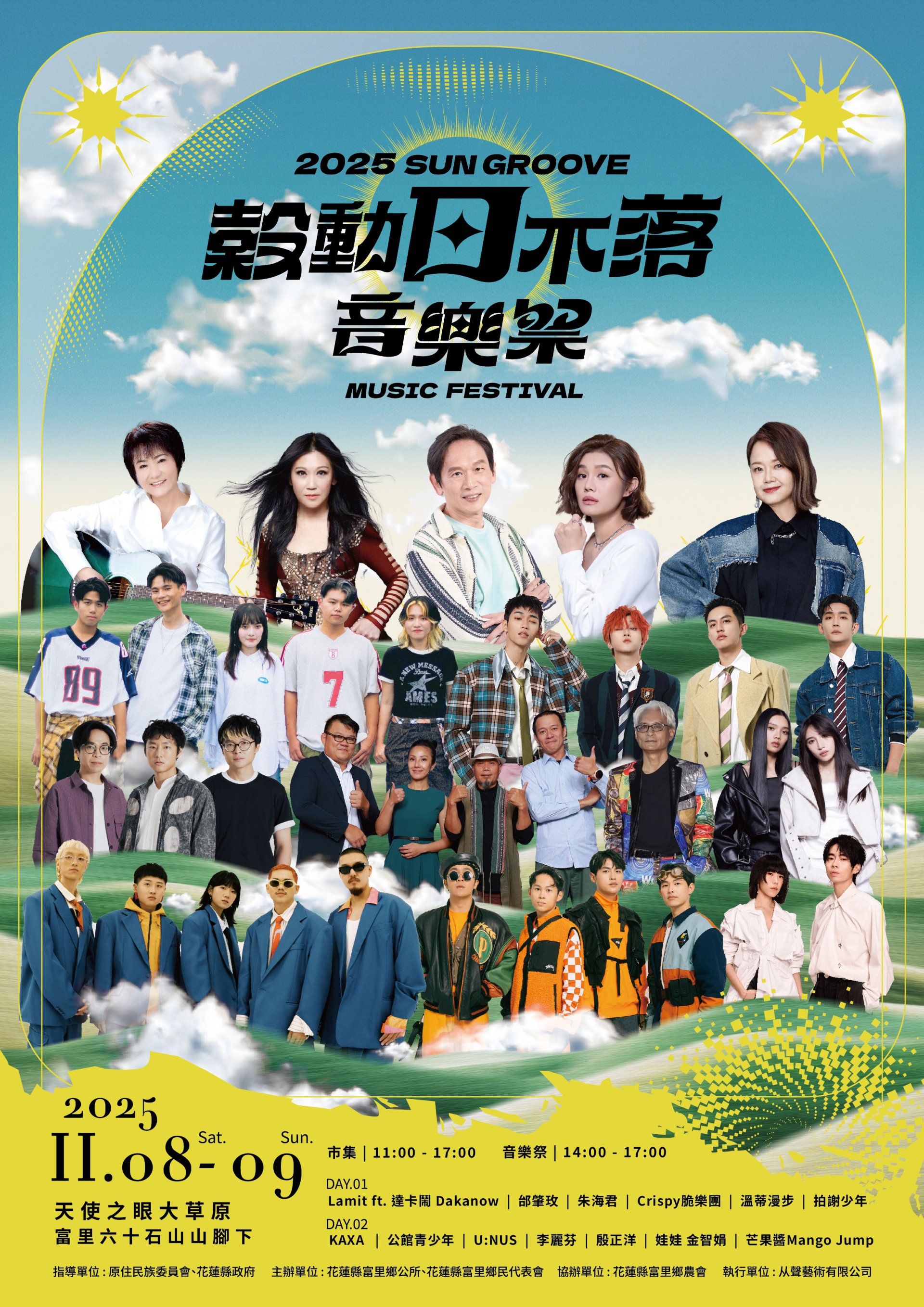 一、114年11月8日(星期六)及11月9日(星期日)上午11時至下午5時,於本鄉天使之眼大草原(富里鄉六十石山山腳下,Google Map搜尋:「穀動日不落音樂祭-活動會場」)盛大舉辦。
