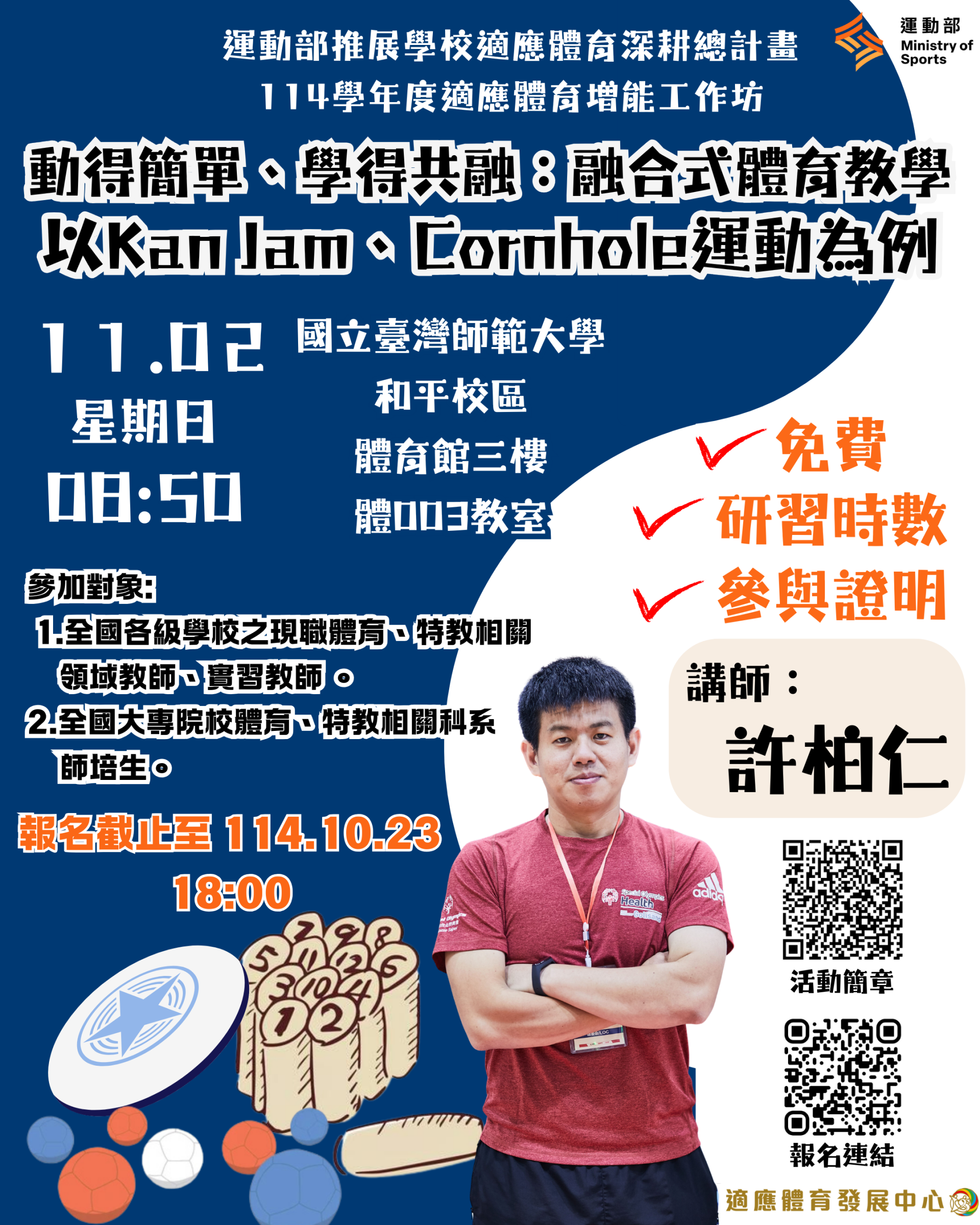 二、為推動學生於校園及社區多元共融發展,透過專題講座及布袋球、飛盤和芬蘭木柱等體驗活動,以增進教師規劃及執行融合式體育活動之實務經驗與專業知能,特委請國立臺灣師範大學辦理旨揭活動。