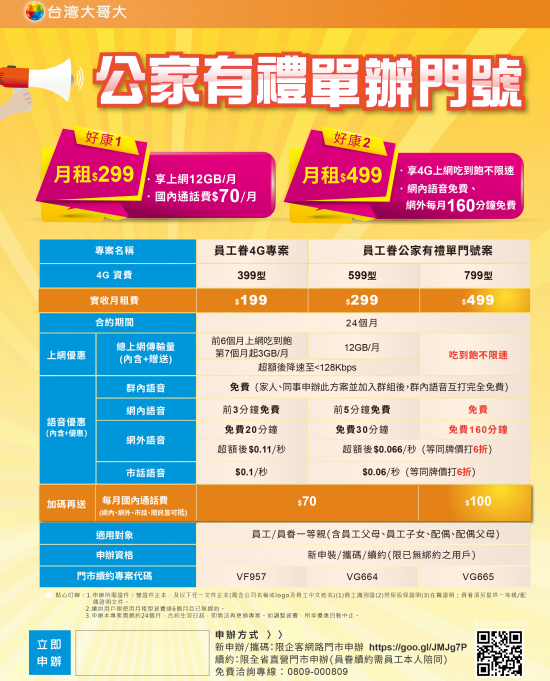台灣大哥大優惠方案如附件『員工及一等親含(父母 配偶 子女 公婆 岳父母)』皆可申辦
