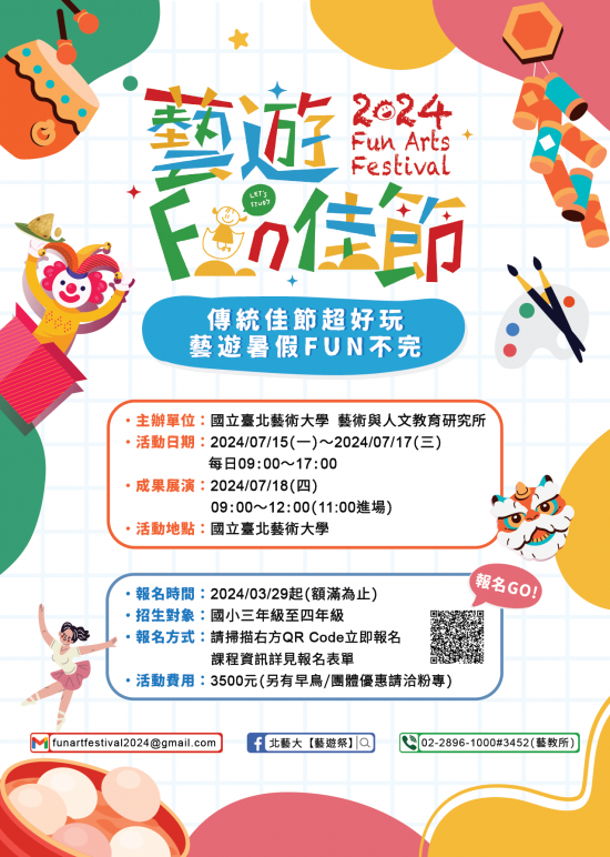 • 國立臺北藝術大學每年度「藝遊祭」兒童藝術夏令營是藝術與人文教育研究所之特色藝術教育推廣活動,今年以「藝遊FUN佳節」為題,以傳統節慶文化結合戲劇、舞蹈、視覺藝術、音樂及新媒體藝術,帶領孩子透過手作、肢體律動、創意發想等體驗及實作課程與活動,感受藝術與生活的深刻連結,激發想像力、創造力並建構全新美感體驗。