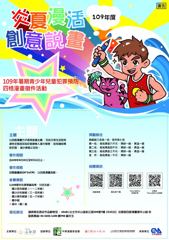 一、財團法人中央通訊社承辦法務部「炎夏『漫』活,創意說『畫』」109年暑期青少年兒童犯罪預防四格漫畫徵件活動,相關簡章及活動內容請參閱附件,敬請踴躍報名參加。