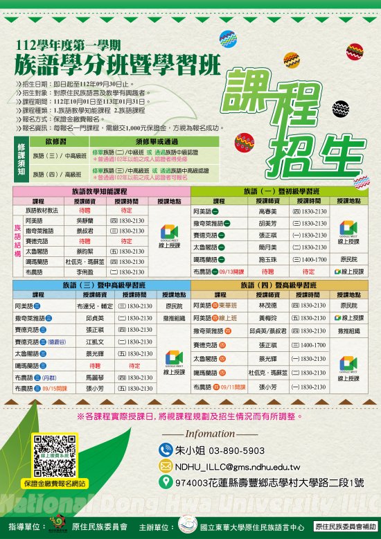 二、    「112學年度第一學期原住民族語言學分班暨學習班」課程相關資訊詳見招生海報。