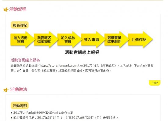 活動流程表如附件,比賽詳情及報名資料,請參考活動網址(http://story.funpark.com.tw/2017)。